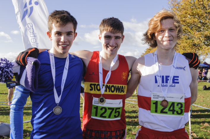 Scottish 4K U20 medallists (L-R) Sol Sweeney, Connor Maclean and Logan Rees will all represent Scotland at Cardiff (photo by Bobby Gavin)